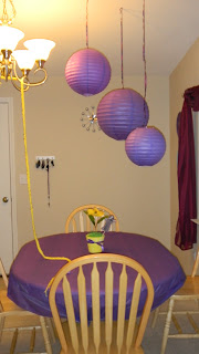 August 25, 2011...today my baby girl turned 4. She has been talking FOREVER about her "Rapunzel" party she informed me(so like her) she would be having. It was so cute the night before her birthday she was soooo excited she could not go to sleep. She got up repeatedly to tell me something silly. I think she knew something was about to happen, and sure enough when we woke the next morning, it was as though Rapunzel herself was in our house. There was hair everywhere!!! Even coming from the ceiling?